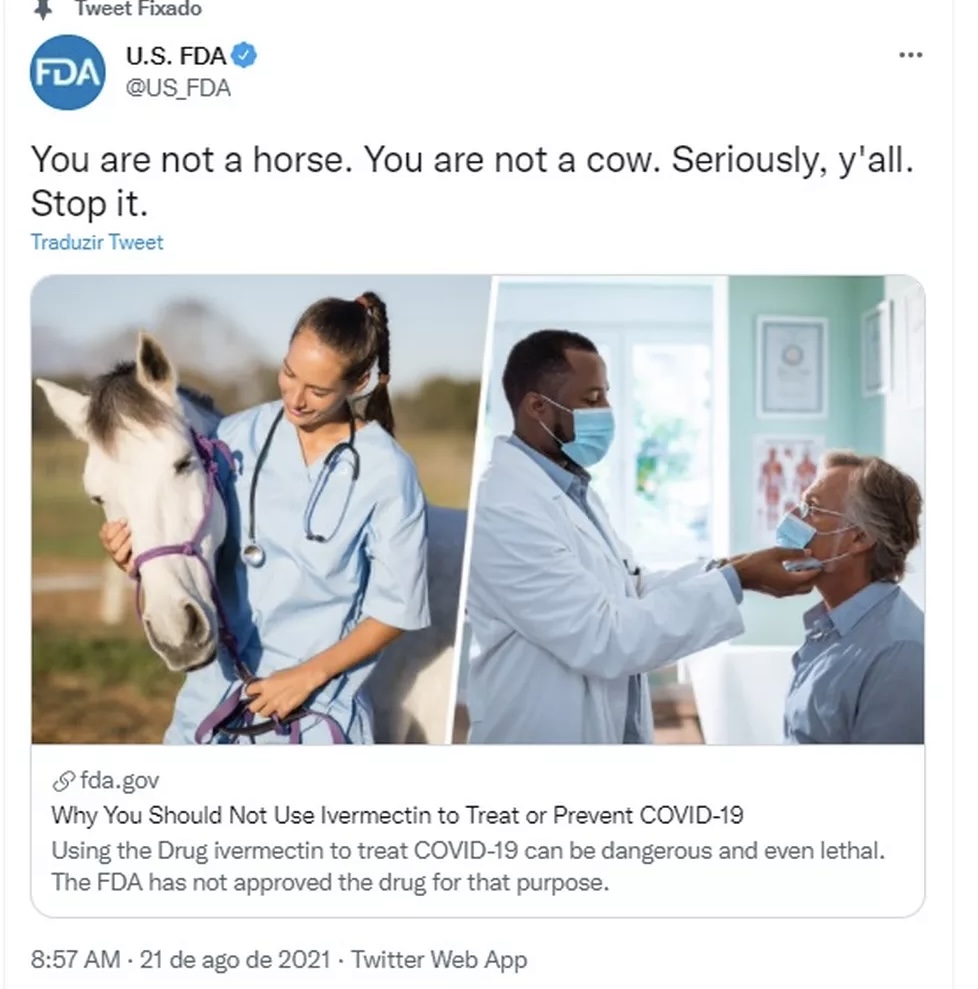 “Você não é um cavalo. Você não é uma vaca. Sério, pessoal, parem com isso”, afirmou a FDA na publicação, trazendo ainda um link para um posicionamento da agência, divulgado em maio deste ano, onde indica: “Por que você não deve usar ivermectina para tratar ou prevenir Covid-19”.